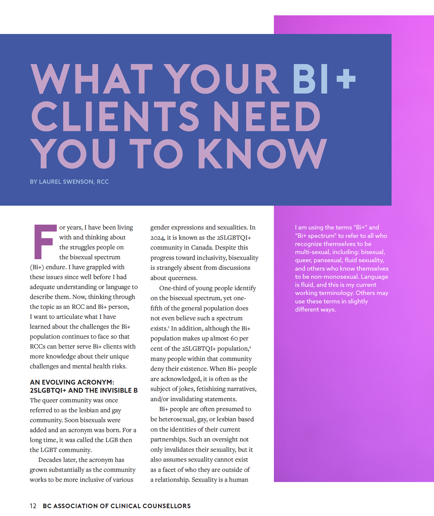 This article, What Your Bi+ Clients Need You To Know, about guiding and educating Registered Clinical Counsellors on important information about counselling clients who fall on the Bisexual spectrum. Insights magazine is the publication serving the members of the British Columbia Association of Clinical Counsellors (BCACC), which means that every RCC receives this magazine in the mail.
